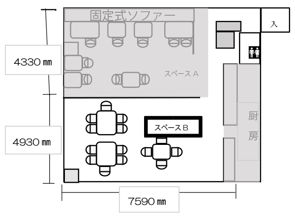 テーブル(大)×3 / テーブル(小)×3 / イス×9 / 固定式ロングソファーあり(9人掛け) / ホワイトボード